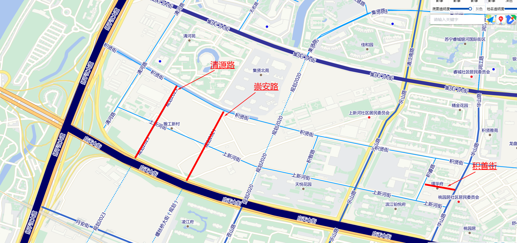 2.崇安路(Chóng′ān Lù):位于兴隆街道仁河社区,清源路(拟命名)以东,乐山路以西,南起应天大街,北止积贤街。长316米,宽16米,沥青路面;道路等级为城市支路;因此处原有跨上新河桥梁“崇安桥”,拟复用老地名,命名为“崇安路”。