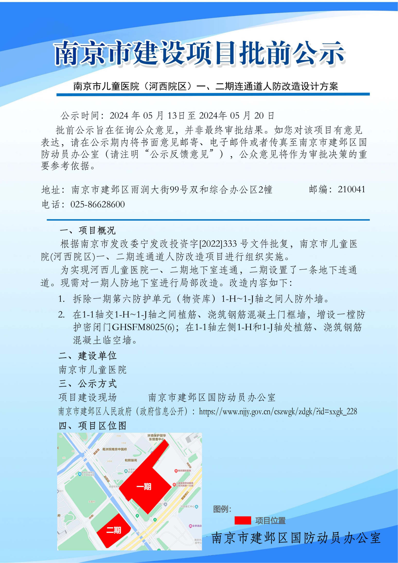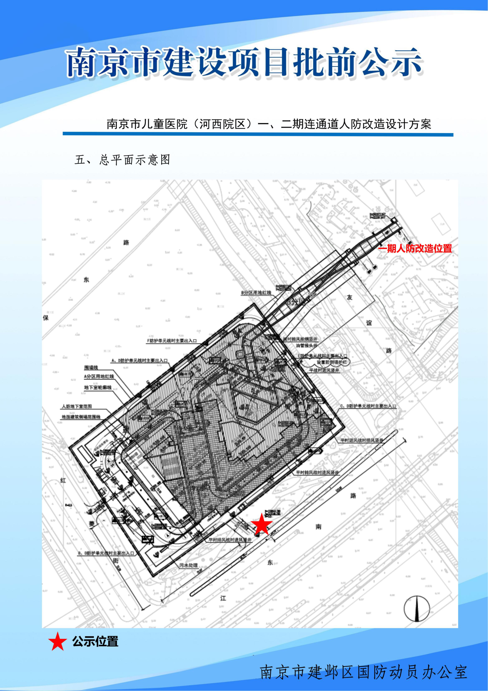 | 信息名称: | 南京市儿童医院(河西院区)一、二期连通道人防改造公示 | ||