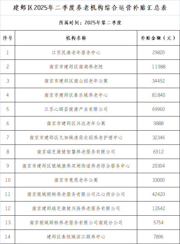 信息名称: | 关于建邺区2025年第二季度养老机构综合运营补贴的公示 | ||
