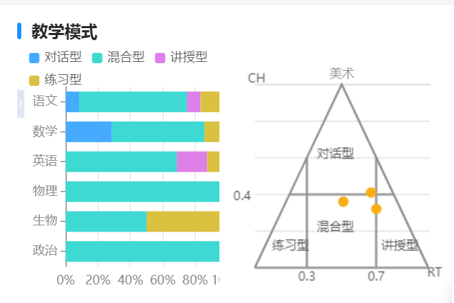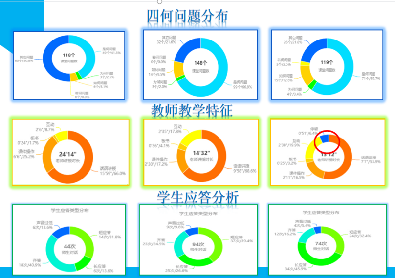 画像促研》的市级展示活动 ▲南京外国语学校河西初级中学开展了主题为《智能研修·精准导航》“,三新”背景下教师专业成长新路径的研究 各学科开展区级智能教研活动。各学科研训员将智能研修的主题列为活动主题,在区教研活动中开展智能研修培训和数据分析等活动。 ▲智能研修应用建邺经验 1.强化循证教研 优化反思 智能研修平台对执教者的课堂教学行为数据和评价者的教学评价数据进行智能采集、统计和分析,可视化表征教师教学行为特征和教学能力水平,为教师教学行为诊断和干预提供数据支撑,实现个性化教研和规模化教研的有机融合,实现执教者的课堂教学反思、同侪的精准帮扶和精准指导。 ▲课堂教学数据切片分析 ▲对教学提问的分析 2.基于实践