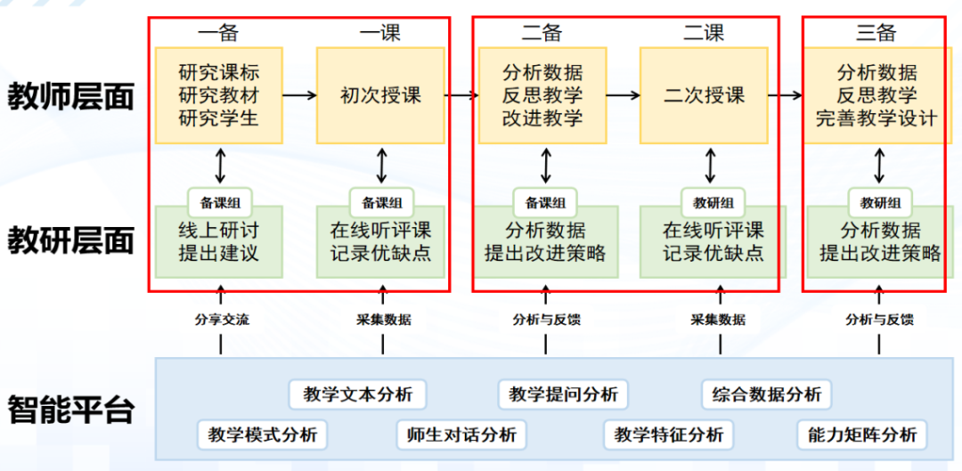 构建范式 对于教研组和学校来说,构建模式是高效应用智能研修的关键。提炼研修模式,让教研组按照模式来开展活动,有助于高效推进智能研修平台的应用。 ▲南京外国语河西初级中学集体备课模式 ▲致远初中三研三思教研模式 ▲金陵中学实验小学A/B式集体备课模式 3.数据积累