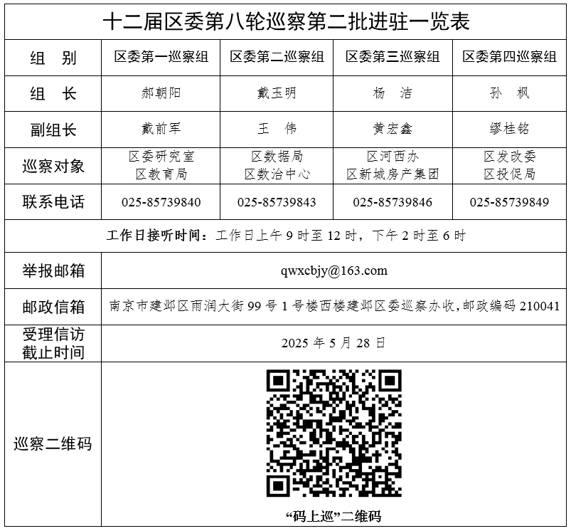 根据区委部署安排,十二届建邺区委第八轮巡察采取压茬推进方式,分两个批次进行。截至2025年3月24日,区委4个巡察组完成第二批进驻工作,分别对区委研究室、区发改委、区教育局、区投促局、区数据局、区数治中心、区河西办、区新城房产集团开展常规巡察。 第一巡察组:巡察区委研究室、区教育局 第二巡察组:巡察区数据局、区数治中心 第三巡察组:巡察区河西办、区新城房产集团 第四巡察组:巡察区发改委、区投促局 本轮巡察坚持以习近平新时代中国特色社会主义思想为指导,深入学习党的二十届三中全会精神,全面贯彻新修订的《中国共产党巡视工作条例》,紧紧围绕政治巡察“四个聚焦”监督重点,坚持问题导向,紧盯主责主业、紧盯“关键少数”、紧盯民生关切、紧盯风险隐患,精准开展政治监督,为推动政府职能转变,营造更好发展环境,全面净化政治生态提供有力支撑。 巡察期间,设立专门值班电话、电子邮箱等,主要受理反映被巡察单位党组织领导班子及其成员、区委管理的其他干部以及下一级主要负责人、相关重点岗位干部(含已离退休、已调离)的违纪违法违规问题信访举报。其他不属于巡察受理范围的信访问题,按规定转相关部门处理。 巡察组受理电话时间为即日起每个工作日上午9时至12时、下午2时至6时,受理信访时间截止到2025年5月28日。