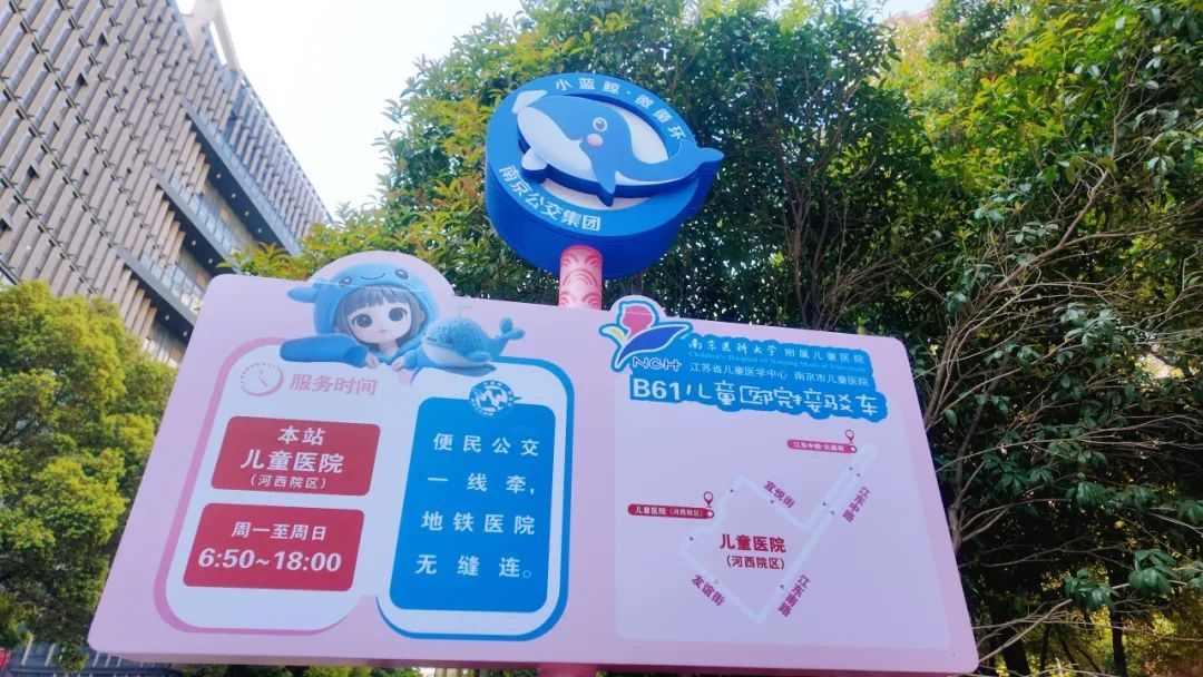 近日,南京儿童医院河西院区“就医公交专线”B61路正式运营,该线路的开通旨在为就诊患儿提供更加便捷的公共交通服务,切实解决就医“最后一公里”难题。 居民从元通地铁站4号口上车一站直达儿童医院河西院区住院部,中途不设站点,让我们一起了解详情。 B61路开通后已有不少居民体验,受到广泛点赞。该线路进入儿童医院河西院区内部停靠,减少了市民步行。 家长表示:“以前要抱着孩子走好远,很吃力,现在下车就是医院。” 这条配备三辆“宝宝巴士”的专线,以10—15分钟/班的间隔循环运营,服务时间为每日6:50—18:00。 线路采用无人售票,单一票价2元,支持电子支付。此外,乘客可享受政府各类优惠或免费乘车政策。 B61路起讫站点:儿童医院河西院区-江东中路·元通南。 沿途停靠点:江东中路·元通南(路西侧上下客)、儿童医院河西院区。 线路自“儿童医院河西院区”起,经儿童医院内部道路、保东路、友谊街、江东南路、江东中路至“江东中路·元通南”。返回由江东中路、江东南路、宜悦街、保东路、儿童医院内部道路至“儿童医院河西院区”。 结合儿童就医特点,“宝宝巴士”采用不同颜色的卡通主题涂装,“小蓝鲸”卡通形象搭配粉嘟嘟、黄嫩嫩的车身,设置特色站牌既方便家长快速识别,又成为孩子们眼中的“打卡点”。 “妈妈,我喜欢这辆粉粉的车”。不少乘坐“宝宝巴士”的孩子对车辆表示喜欢,在站点旁还有小朋友主动要和车辆合影。 带孩子来就医的张女士称赞道:“车辆、站台的设计都很受孩子们的欢迎,南京公交这次推出的宝宝巴士真是为城市街道增添了一抹亮色,也在潜移默化中缓解了孩子们就医的紧张情绪。” 此外,车辆采用低地板无障碍设计,方便推车上下,车内预留了专门的空间容纳固定儿童推车。