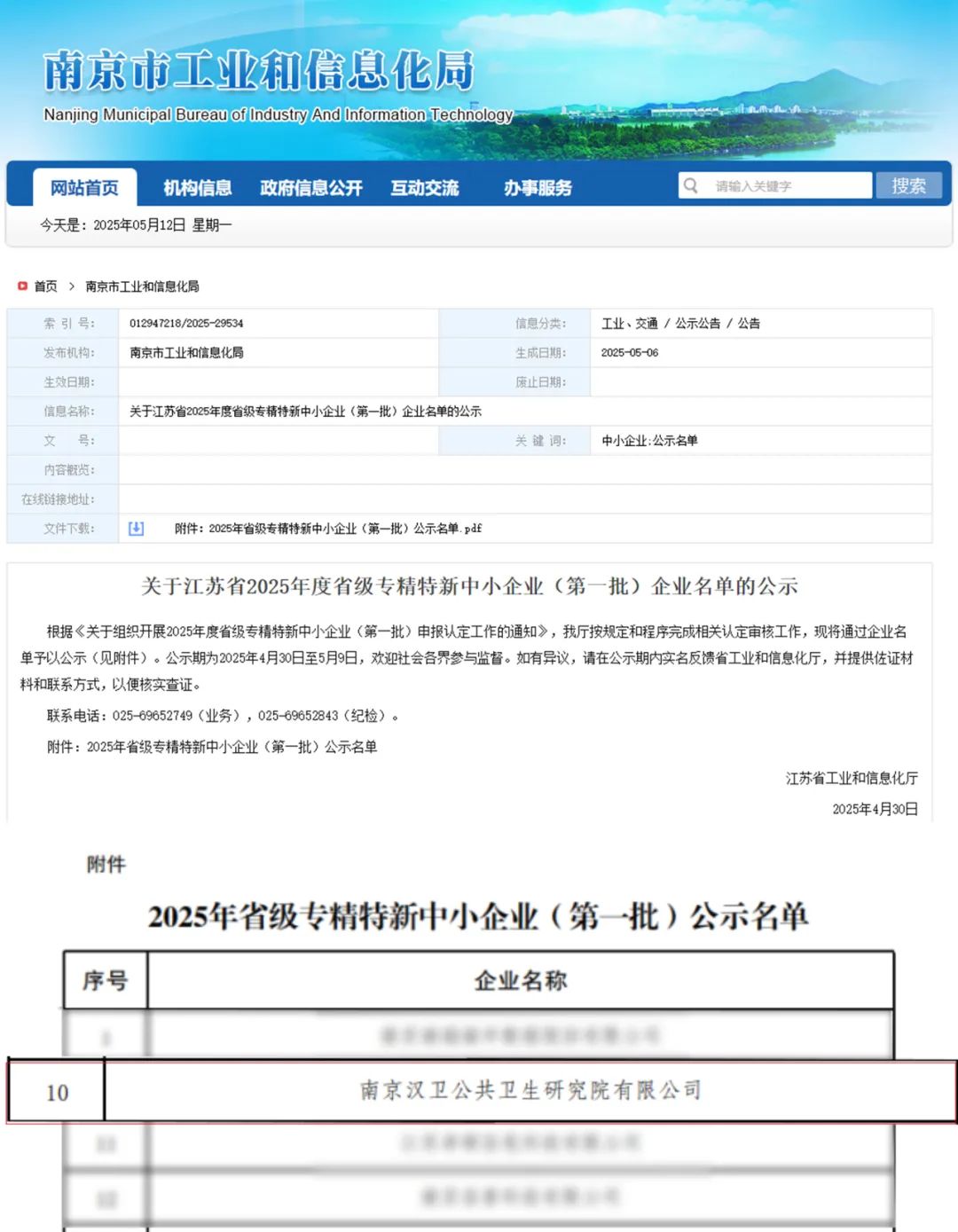 近日,江苏省工业和信息化厅公示了2025年度省级专精特新中小企业(第一批)名单,建邺高新区企业南京汉卫公共卫生研究院(以下简称“汉卫研究院”)凭借在公共卫生领域的突出创新能力和行业影响力成功入围。这一荣誉不仅是对汉卫研究院多年深耕细分领域坚持技术创新的高度认可,更是对其未来发展的有力激励。