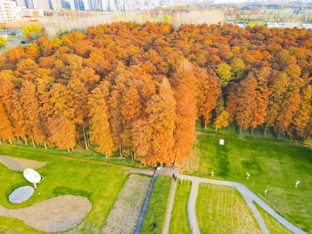 初冬的南京万物静静沉淀,而在建邺区江心洲却有一片森林已悄然换上最热烈的装扮。近日,江心洲池杉林的数千株池杉迎来最佳观赏期,层林尽染,赭红夺目,与不远处的地标南京眼、双子塔构成了一幅自然与现代交织的独特画卷,吸引了大批市民游客前来打卡。 走进这片被大草坪温柔环抱的池杉林,仿佛瞬间从都市的喧嚣步入了一片静谧的童话世界。池杉的针叶已由夏日的苍翠尽数转为深红、锈红与金棕,色彩斑斓,如同一簇燃烧的火焰,在微风中轻轻摇曳,诉说着季节更迭的私语。 林间,一条蜿蜒曲折的木质栈道成为探索这片秘境的最佳路径。栈道设计精巧,与自然环境浑然一体,引导着人们深入林腹。随处可见的是端着“长枪短炮”的摄影爱好者,或是举着手机寻找最佳角度的年轻人。 从高空俯瞰,赭红色的池杉林如同在大地绿毯上精心绣出的一块华美织锦,方正而浓烈。更令人叫绝的是,以这片红杉为前景,现代化的城市地标——南京眼步行桥、双子塔恰好嵌入画面,构成绝佳的视觉焦点。 自然生命的蓬勃色彩与人类建筑的几何之美,在航拍镜头下和谐共鸣,不少摄影爱好者操控无人机升起,只为捕捉这“一林、一桥、两塔”同框的经典瞬间。 这个冬天,不必远行。在建邺,在江心洲,一场关于色彩、自然与城市风貌的邂逅正在上演。趁阳光正好,不妨来此漫步栈道,仰望红杉,用镜头收藏这份专属于金陵初冬的浪漫。